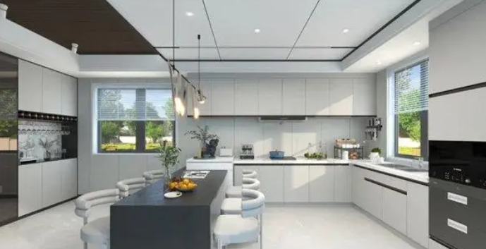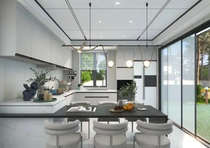 頂部以白色蜂窩大板吊頂,線型燈帶和筒燈相結合,打造簡約時尚現代廚房。